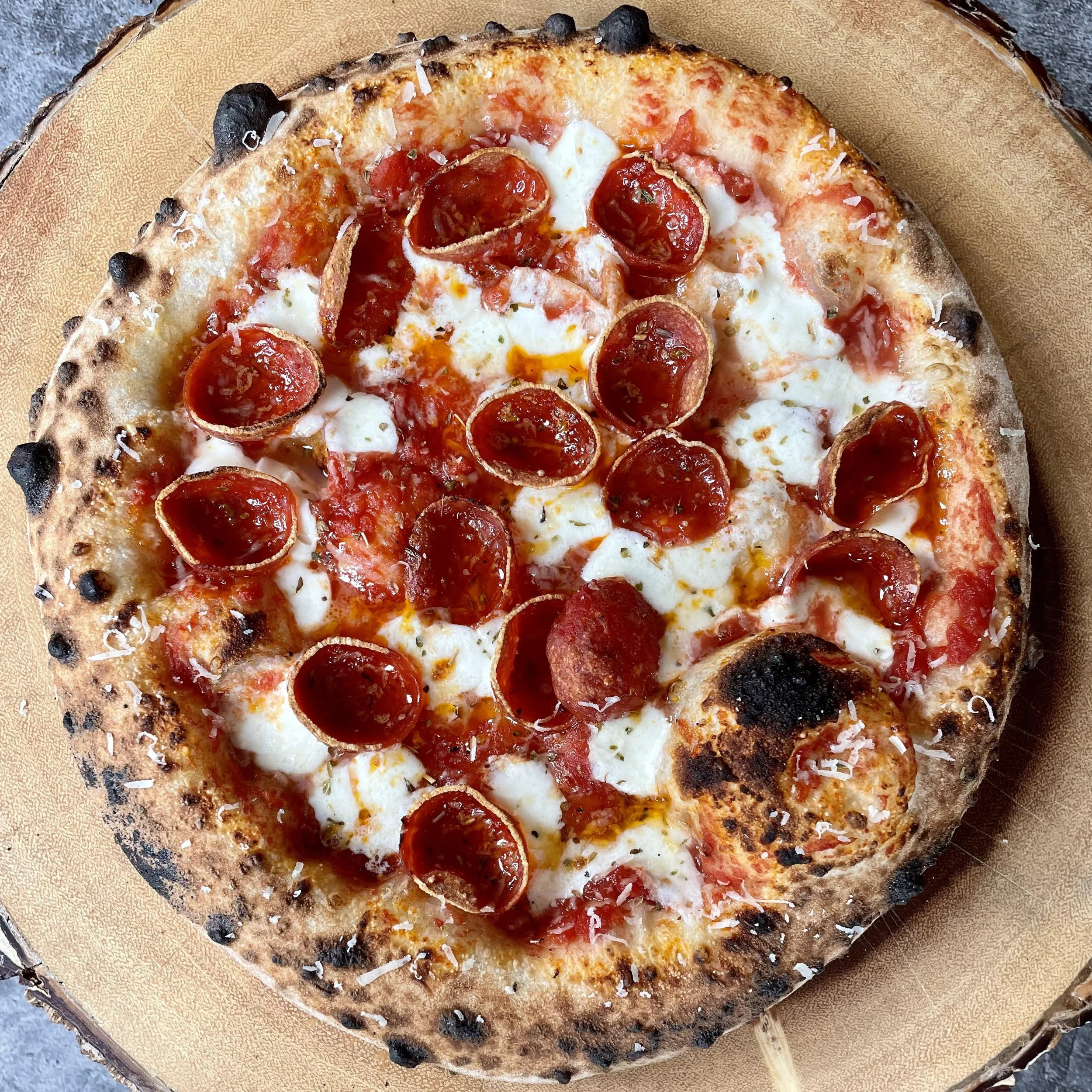Hand-crushed Italian San Marzano tomatoes, fior di latte from Sianno Mozarella in Charlotte, NC, pepperoni from First Hand Foods in Durham, NC, hot honey, parmesan, and Italian EVOO.