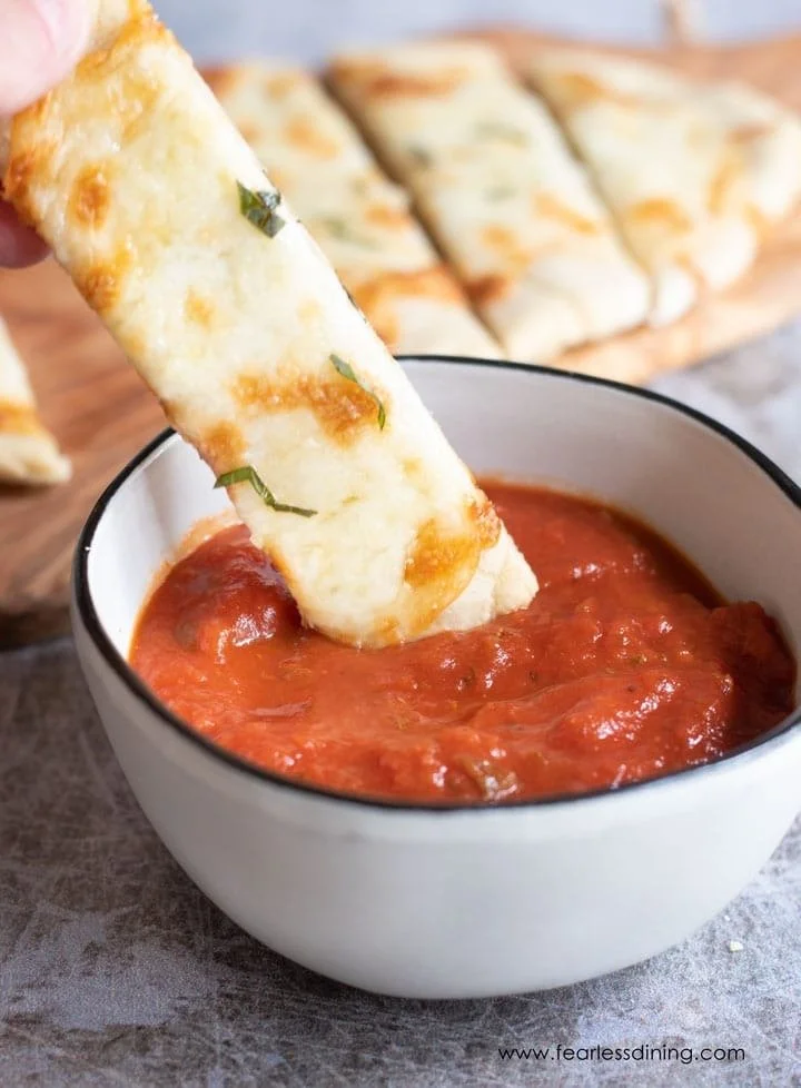 Flour, yeast, sugar, garlic powder, butter, salt, dried parsley, and marinara on the side.