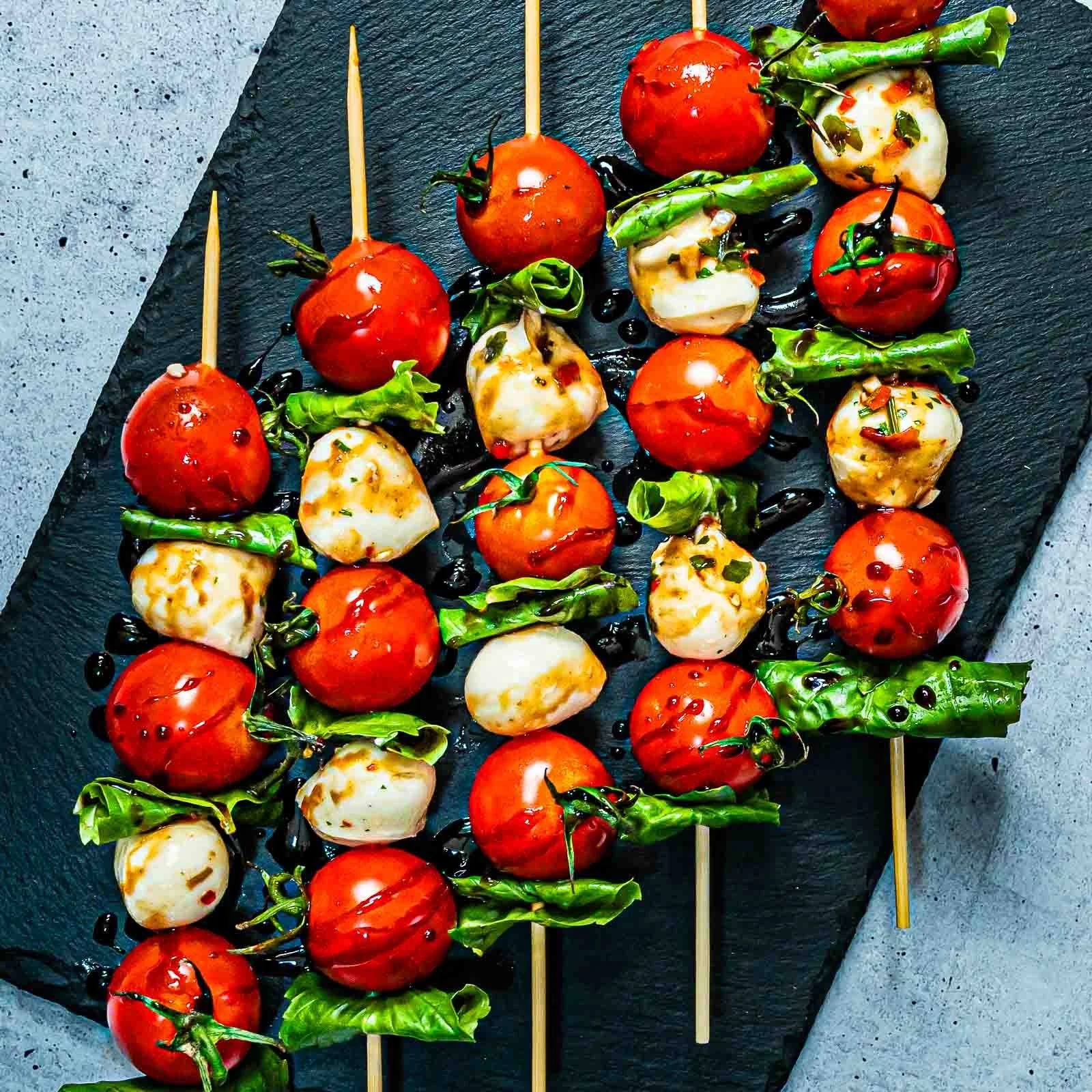Mozzarella pearls, cherry tomatoes, basil, EVOO, and balsamic glaze.